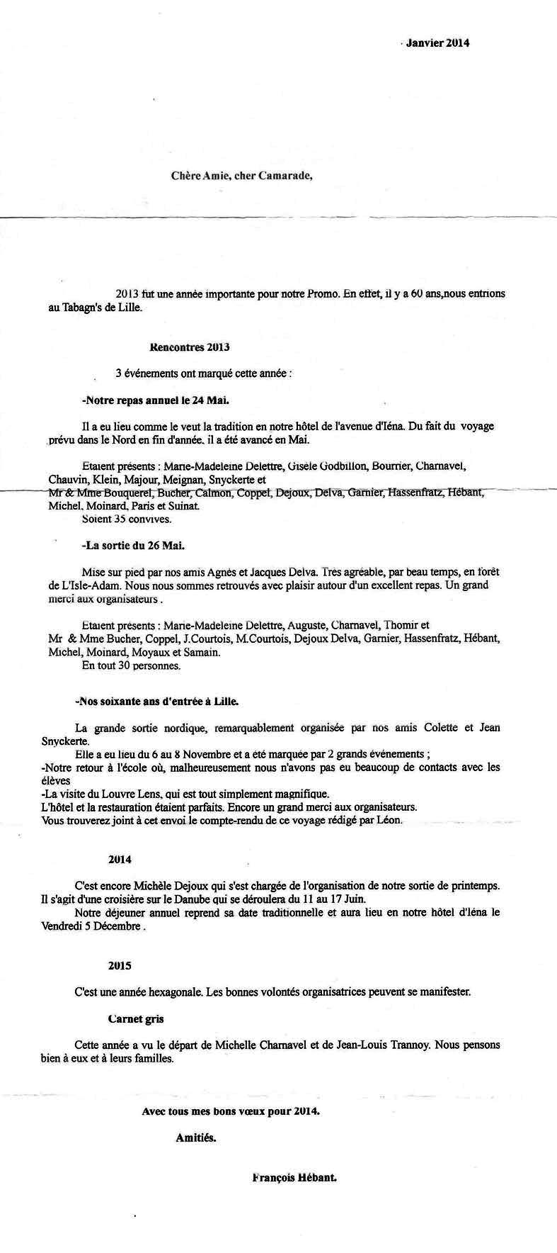| Compte Rendu De l'Année 2009 par notre camarade François Hébant Compte Rendu de l'Année 2010 par notre camarade François Hébant Compte Rendu de l'Année 2011 par notre camarade François Hébant Compte Rendu de l'Année 2012 par notre camarade François Hébant Compte Rendu de l'Année 2013 par notre camarade François Hébant Compte Rendu de l'Année 2014 par notre camarade François Hébant Compte Rendu de l'Année 2015 par notre camarade François Hébant Notre camarade Jean Louis Trannoy nous a quitté le 25 juillet 2013, ses obsèques ont été célébrées à Valenciennes le 30 juillet, auxquelles assistaient Jean Snyckerte et Jean Thomir, ainsi que Adry Darguesse, et avec une bonne représentation du groupe de Valenciennes et du Rotary. Nous présentons nos plus sincères condoléances à son épouse Michelle. Suite à une longue maladie, Gisèle Godbillon nous a quitté le 21 mars 2014. Nous nous souviendrons tous de sa présence dans notre groupe lors des rencontres ou voyages, et notamment notre dernier voyage en Croatie en 2011. Personne n'ayant pu assister aux obsèques, une lettre de condoléances a été envoyée à la famille par François Hébant au nom de la promo. Nous apprenons le décès de notre camarade Jean Douvier le 12 novembre 2014. Nous n'avions pas connaissance de faits qui auraient envisagé ce décès. Il était présent au repas de décembre 2011, et peut-être 2012. Il refusait de se connecter à Internet, il n'avait donc pas d'adresse mail. Nous présentons nos sincères condoléances à son épouse, ses enfants et sa famille, en nous souvenant qu'il était l'initiateur de la Chorale de la Promo. Dernière nouvelle, nous apprenons le décès de Jacques Delombre à Cannes le 17 mars 2015 il sera inhumé en Suède le 10 avril. Toute la promo présente ses condoléances à sa famille Anne Marie Bucher est décédée le 11 juin 2015, nous regretterons tous sa sympathique présence à nos réunions et voyages. Les obsèques d'Anne Marie se sont déroulées le 17 juin en l'église St Léger à Oyonnax en présence d'une nombreuse assistance. La promo était représentée par Claude Michel, Line et René Suinat, Michelle et Georges Coppel, Chantal et Walter Bouquerel. Comme suggéré, un don à été remis au nom du Secours Catholique en l'absence de fleurs ou couronnes. Nous ajoutons une bien triste nouvelle qui touche notre camarade Gilbert Dejoux et Michèle, le décès de leur fils Bruno Dejoux décédé le 12 juillet 2015. Nous prenons part à leur douleur et leur adressons toute notre amitié. Nous avons été informés à postériori du décès de Jeanine Le Corviger le 1er octobre 2015. Marguerite Feru nous a quittés le 28 novembre 2015 des suites d'une longue maladie, Claude Michel a représenté la promo aux obsèques célébrées à Eguzon. et Jean Féru a été très touché par les marques de sympathie des camarades de la promo. Nous avons à déplorer la disparition d'Arlette Croguennec le 27 décembre 2015. Geoges Coppel, Henri Moinard et Walter Bouquerel accompagnés de leurs épouses ont assisté aux obsèques célébrées le 30 en l'Abbaye de Mozac pour représenter la Promo. Pour ajouter à cette longue liste de disparitions, c'est Marie Thérèse Courtois qui nous a quittés suite à une douloureuse maladie le 15 mars 2015. Ses obsèques ont été célébrées le 21 mars à Rueil en présence d'une très nombreuse assistance dont de nombreux camarades. Nous avons pu obtenir que Michel participe à notre voyage de promo en Hollande. Deux décès presque simultanés ont endeuillé la promotion le 10 juin 2016, Michel Gauthier dont la santé s'était déteriorée depuis quelques années, et Louis Charnavel le 11 juin, dont le décès rapide et inattendu est dû à une maladie cancereuse. Les obsèques de Michel Gauthier se sont déroulées le 16 juin 2016à St Cloud. Celles de Louis Charnavel le 17 juin à St Jean d'Aulps en Savoie, son pays d'origine. Plusieurs camarades de la promo ont accompagné Michel et Louis à leurs obsèques. Jacques Hamel a été informé du décès de Michel Frère par sa fille, en 2016 probablement. Son épouse était décédée depuis quelques années. J F Briolat est décédé le 14 juillet 2017, il était veuf et vivait depuis quelques années dans une maison de retraite à Bonnières sur Seine, je n'ai pas d'autre info. Le 29 août, c'est notre ami Michel Langot qui nous quitte, son épouse Nicole suit de près les informations de la promo qu'elle a cotoyée du temps de notre école. Le 11 novembre, c'est Paul Procureur qui quitte ce monde, nous ne l'avons appris que tardivement. Début 2018, c'est Jean Thomir qui décède le 24 janvier suite à un AVC, il était veuf depuis 20 ans. Et le 29 janvier C'est Luc Princelle qui décède suite à un cancer et AVC. Le 20 janvier 2019, c'est notre camarade Jean Claude Charriot qui nous quitte à l'issue d'une période difficile. Michèle Dejoux nous a quittés le 1er février 2019 après une longue période de maladie, ses obsèques ont lieu le 8 à Meaux. Souvenons nous qu'elle avait organisé plusieurs voyages de promo avec succès. Notre camarade Jean Paul Forey est décédé le 2 juin 2019 à la suite d'un cancer. JC Calmon a représenté la promo et a rédigé un petit CR. Sa fille Valérie m'a appris le décès de son épouse Noelle en mai 2000. Notre camarade Henri Moinard est décédé le 11 mai 2022 suite à une chute et une fracture du crane quelques jours avant le voyage en Bourgogne auquel il devait participer. Michelle et Georges Coppel, Claude Bucher et Walter Bouquerel se sont déplacés depuis dijon pour assister aux obsèques où assistaient également Jacques Delva, Gilbert Dejoux, Michel Courtois et Jeannette Hassenfratz. (Photo) Avec beaucoup de retard nous avons appris le décès de Jean Croguennec le 8 juin 2022 dans la maison de retraite où il s'était retiré à Morlaix après le décès d'Arlette. Après une période difficile et un sé